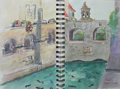 The interior courtyard of Tvrdalj, with the arcade round the fishpond and dovecot tower above. Original housing was single story.