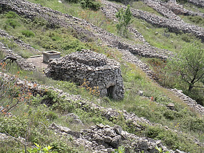 Set here and there amongst the walled fields of Hvar’s agricultural landscape, you’ll see stone shelters. I’m not talking here about the newer type of weekend houses that have sprung up – complete with BBQ and shady terrace for Sunday lunch. No, the ones I mean are much older, of drystone construction, and some have been there for centuries. It’s apparently quite hard to tell when an individual structure was built, as some can date from prehistoric times, while others might be medieval or later. The architecture doesn’t tell you, you have to go by any artifacts you can uncover on the site.