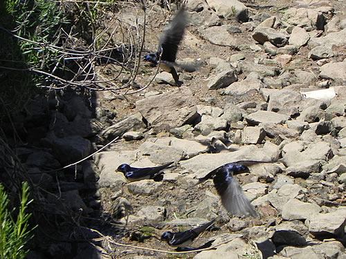 The nests are built up by sticking gobfuls of mud to the wall – in the photo above, one wee chap is busy with his foundations, while his neighbour is already finished, and sitting inside.
