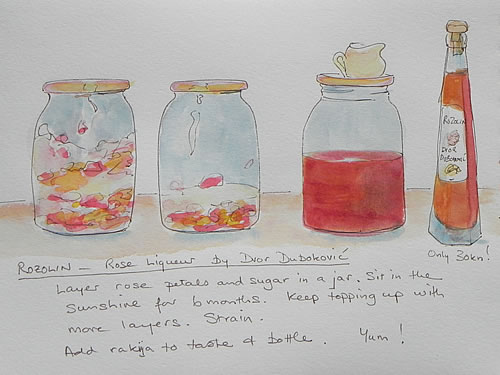 Layer rose petals and sugar in a jar. Sit in sunshine for 6 months. Keep topping up the layers. Strain, add rakija to taste and bottle. Drink!