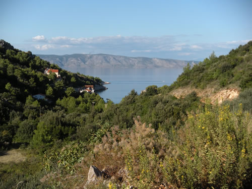 The bay faces north, so you have a view over to the neighbouring island of Brač. The road is a rocky track through pine trees, and in September, when we visited, there was purple heather by the roadside – a nice touch!