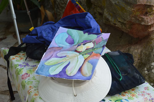 For lunch we assembled a potluck and enjoyed freshly picked grapes and figs. A glass of wine set us up for our afternoon of painting. We had so many places to choose from, so many ideas of what to paint. At one point in the afternoon, we were called over to the caper bush, where a grasshopper had been spotted emerging from its previous coat. Amazing how much bigger it becomes in moulting!