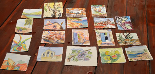 While we were waiting, we set out our small paintings on the table and admired them all. It was fun to see that many were miniature versions of those that I saw being painted on site during the week. In the swap, we all got a painting from each of the other artists, which makes a wonderful memory of the week!