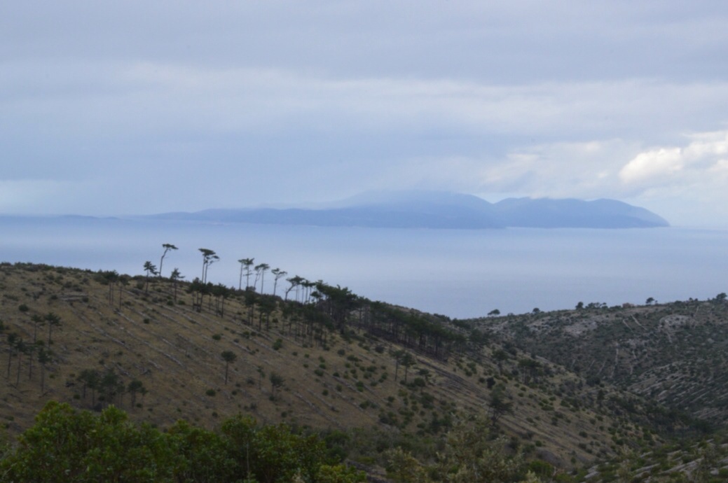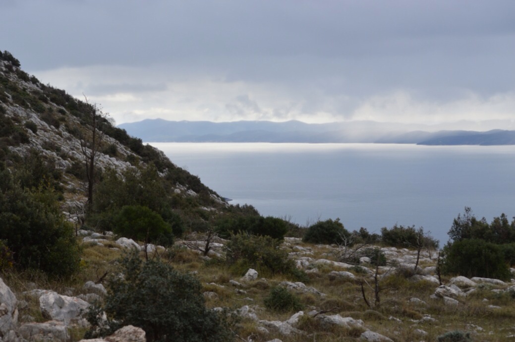 Directly south in the distance is an unfamiliar island, Sušac, sporting a heavy black cloud over it. Between here and there, the sun catches the water for a beautiful, silvery effect.