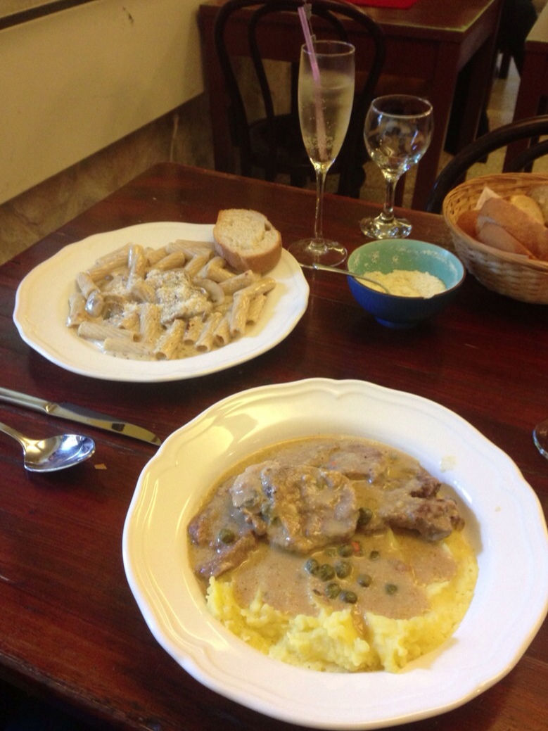 Despite the sun, the air was a touch chilly so we went inside. They looked quite busy, always a good sign! Although not everything on the menu was actually available, we managed to find a couple of choices that we liked. In my case the Penne with Gorgonzola and Mushrooms, and for himself, the Ox Tongue in Horseradish Sauce. As you can see, we’re not both veggie!