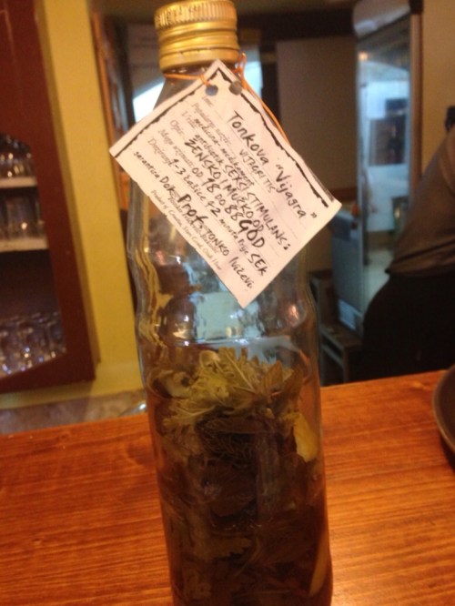 There was some lovely, interesting artwork by local artists – always enjoy seeing that. There was also a fascinating collection of objects on and around the bar, including a trumpet, a “No Spitting” sign, and a bottle of herbs labelled Tony’s Viagra!