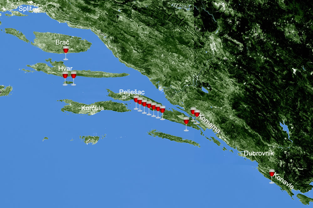 The prime growing areas for Plavac, ie those producing the best quality wine tend to be steep mountain slopes facing south or south-east, overlooking the sea. Critically, they’re protected from that freezing north-east wind, the bura. I’ve tried to show on the map where each of today’s wineries are located, and you can see just how many are on the Pelješac peninsula, especially around the slopes of Dingač / Postup. But look, two of the wineries are on Hvar! The Ivan Dolac / Sv Nedjelja vineyards produce Hvar’s best Plavac.