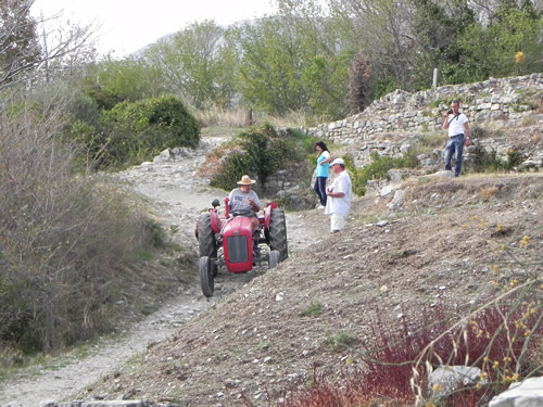 Talking of vehicles, remarkably the old gate is still is use as local access to the olive groves and vineyards is through that way. Here comes a tractor on its way back from the fields!