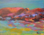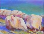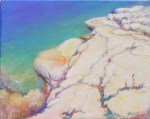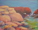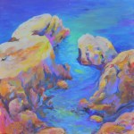 It’s been a couple of years since I started painting the rocks and water of this beautiful coastline – and what an absorbing subject it has been! Considering that I only started it because of a very restricted pallette – mostly cool blues and turquoises and very few of the warm yellow, orange & red shades. But with a bright idea and some small 8″x10″ canvases, I was off and running. Here’s a reprise of the early paintings: