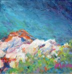 It was recently pointed out to me that I can actually take the canvas off the supports and roll it up for travel – now, why didn’t I think of that myself? So the latest Rocks (#24) is the biggest yet, at 30″x40″! For me, that’s a big step up, not just in terms of getting paint on that acreage of canvas, but also in carrying the thing to my critique group without damaging it. Best not attempted on a windy day!