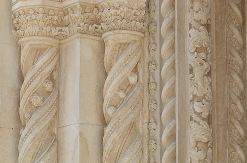 Here’s a closer view of the top part of the main portal, showing how the scrolls of the pillars wrap very prettily around Jesus’ halo! The paler figures here would appear to be recent replacements, part of the ongoing maintenance and restoration work.