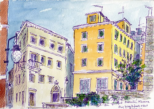 Meanwhile, here are today’s sketches. In the first one, I filtered out all the messy construction work going on as the building on the left is currently being converted into a luxury hotel. Ah, the advantages of a sketchbook over a photograph! Love the Šibenik streetlights, too!