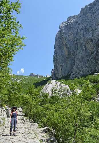 At the south end of Velebit, two deep canyons have formed as rivers forced their way from the high plateau down to the sea. Velika Paklenica – big or Great Paklenica canyon still has its river for most of the year, while Mala Paklenica (Little Paklenica) has only a seasonal stream. Himself has vivid memories of visiting Mala Paklenica during a thunderstorm when he was only a young lad, and how the noise reverberated off the canyon walls in a very exciting way! Thankfully, the weather doesn’t look at all threatening for us today, although it is very hot for early May.