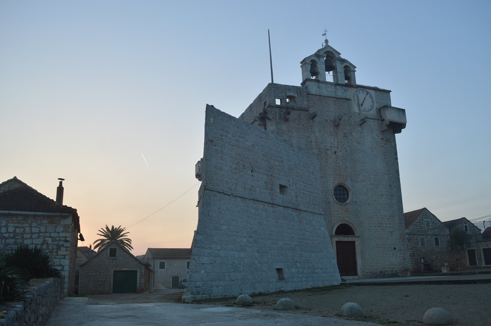 At this time of year, sunrise is at 6:48am, so best to wrap up warmly! Later in the day It would feel warm In the full sun, though the air stays pretty cool. In the pale early light, the fortress church of Sv Marija is in shade, with the cool pink glow of the sun behind it.