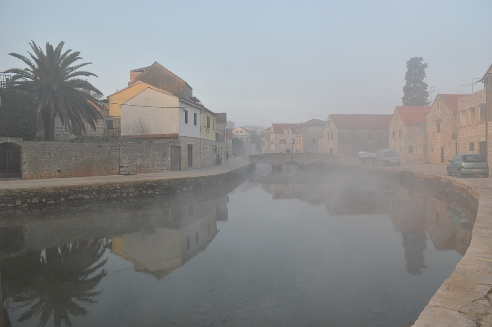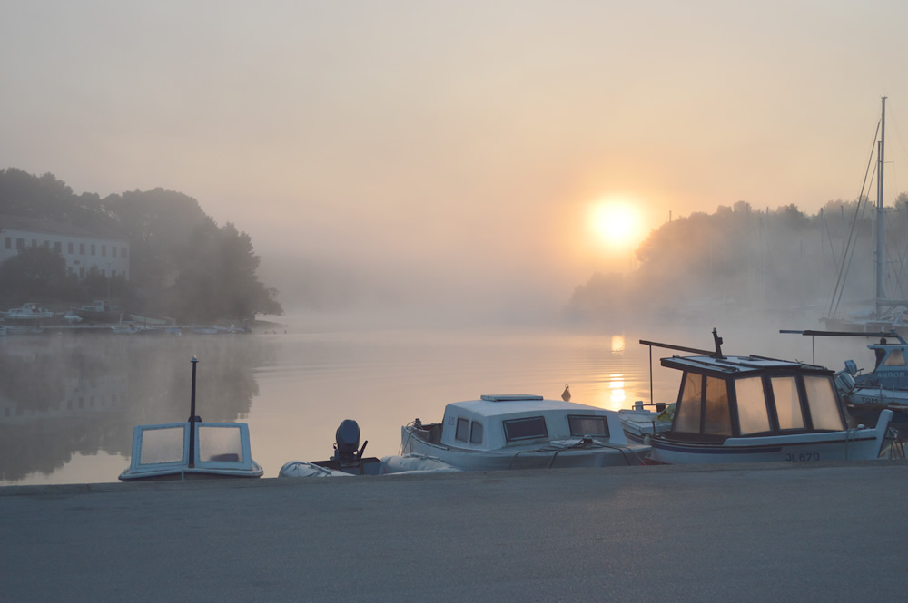 Hvar in February is beautiful, appearing in a completely different light from the heat of summer. This morning, for instance, I was drawn to take my camera for a walk by the most perfect atmospheric sunrise. Somewhat unusually, we were enveloped in dense fog, with very little of the wider landscape showing, meanwhile the sun slid into view as a warm orange disc. Stunning!