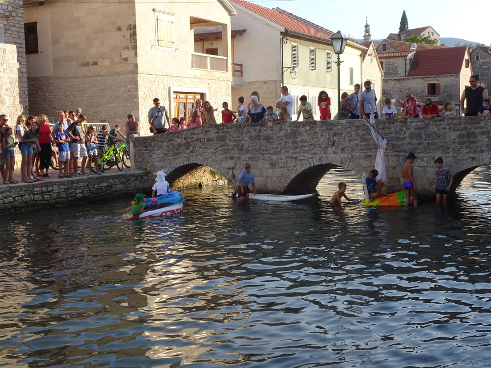 One of my favourite events in the Vrboska summer calendar is the annual crazy boat race. This year we had three entrants – a colourful pirate boat powered by a dustbin lid on a pole and two energetic outboard propellers, a UFO with two delightful green-faced aliens, and a fishing surfboard with a crew of several onboard and in-water paddlers. The start of the race is at the 3-arch bridge, everyone ready to go!