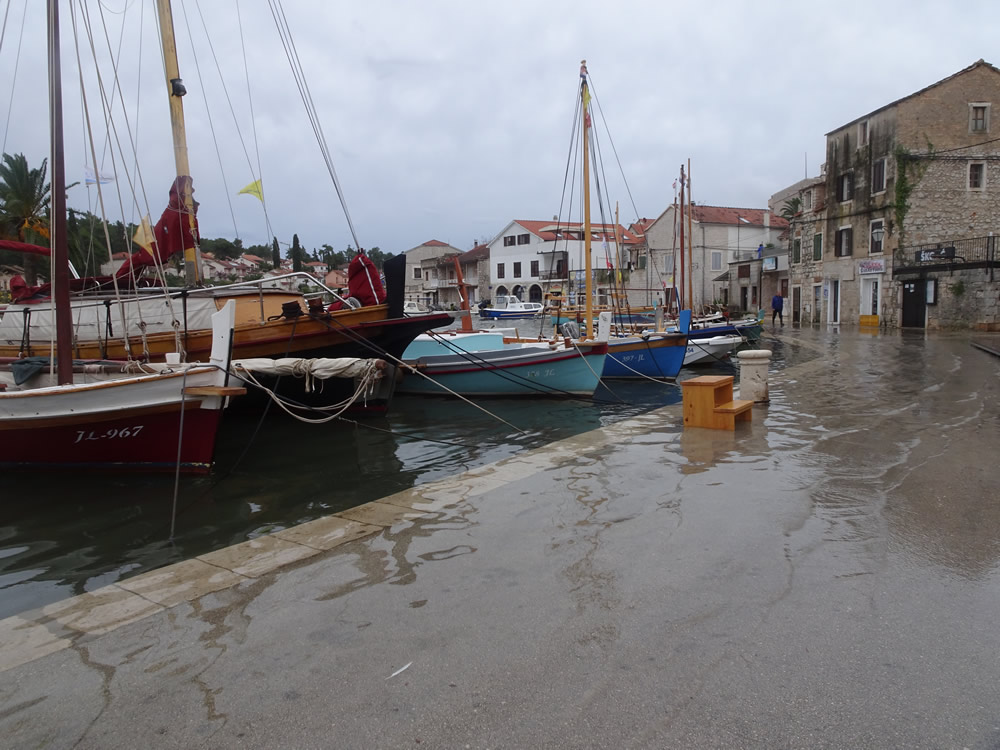 Here in Vrboska, the mountains protect us from the main force of the jugo, which blows directly from the south. By the time we receive it, the wind has curved around the terrain and arrives from the southeast, whipping up waves into the entrance of our long, narrow inlet. The wind may not be as powerful by that time, but if the timing of the gusts and the waves resonate, plus the air pressure is low and rapidly changing, it can set us up for an interesting effect in the harbour, known locally as šćiga.